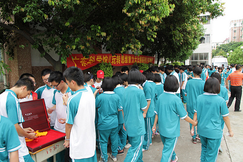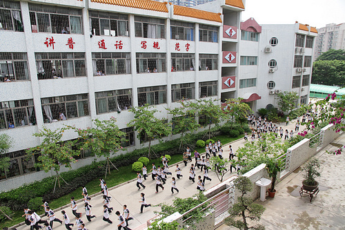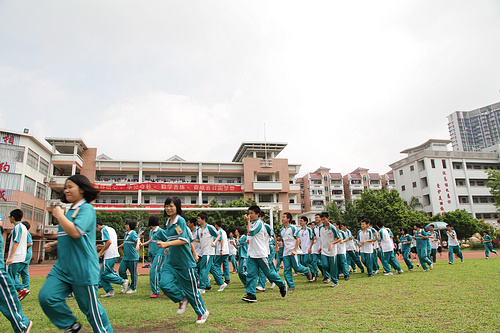 5月12日上午10时,广州番禺洛溪新城中学2千余名师生从教室、宿舍紧急疏散到操场(张炜哲 摄)